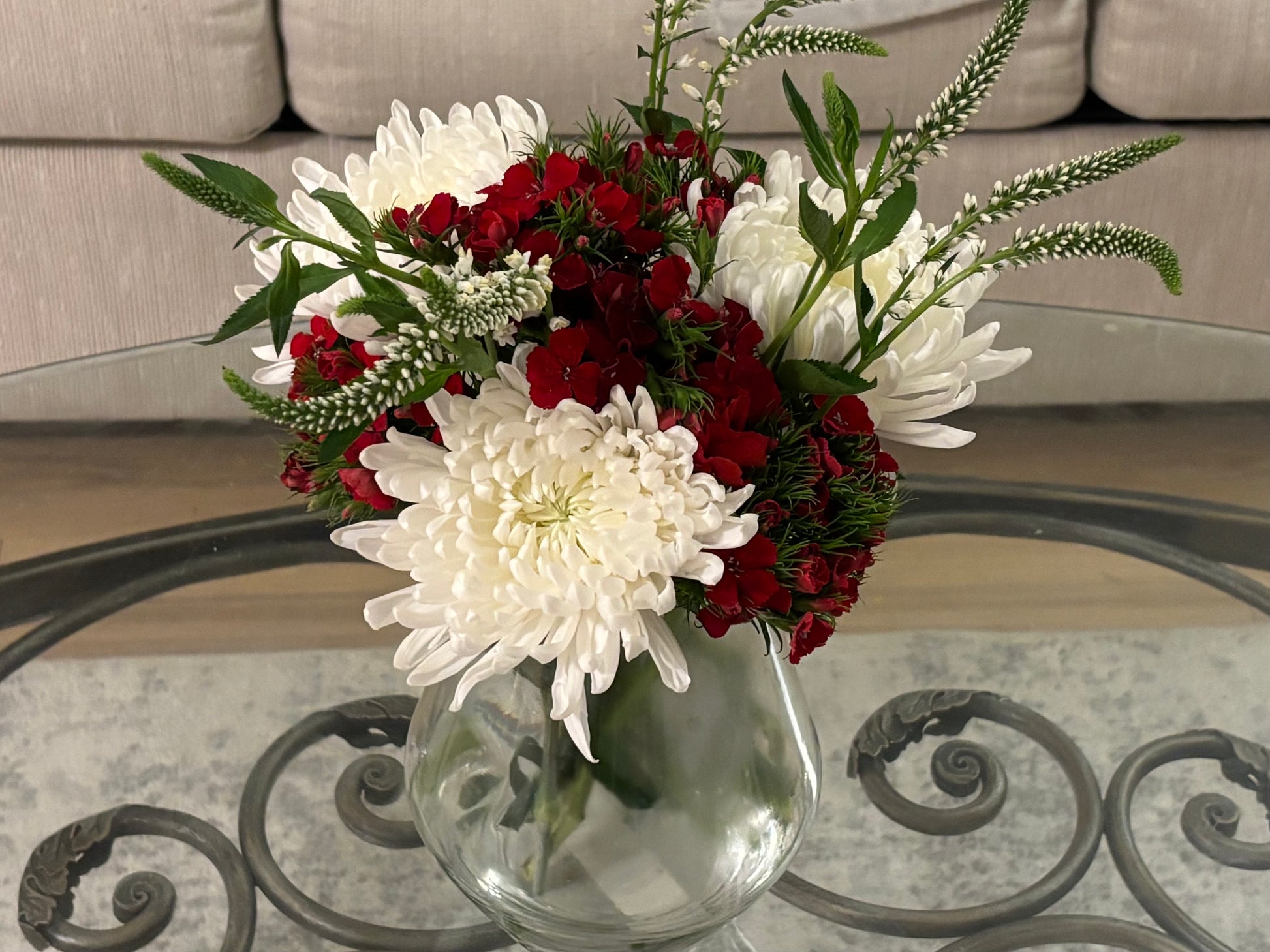 Elegant and timeless, White Star Line captures the beauty of classic white blooms with graceful texture and movement. Luxurious jumbo mums form the heart of the arrangement, their soft petals radiating purity and light. Carnations add gentle layers of ruffled charm, while Sweet Amazons bring a modern sophistication with their crisp, sculptural blooms. Delicate Veronica stems reach upward, lending a touch of airy grace and natural flow.